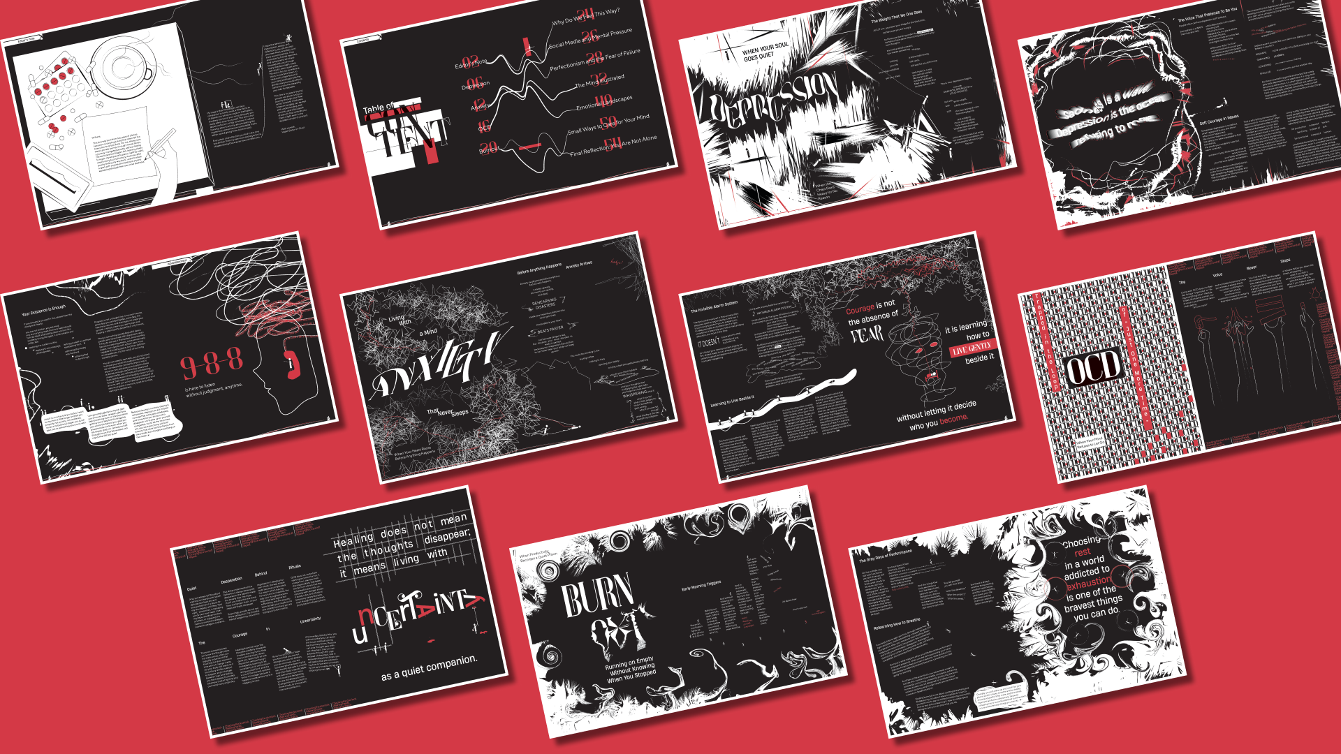 I researched four key areas: Depression, Anxiety, OCD, and Burnout. I developed a cohesive visual system with custom illustrations for each emotional state, then designed the full magazine layout, including feature spreads, covers, and supporting stickers and posters.